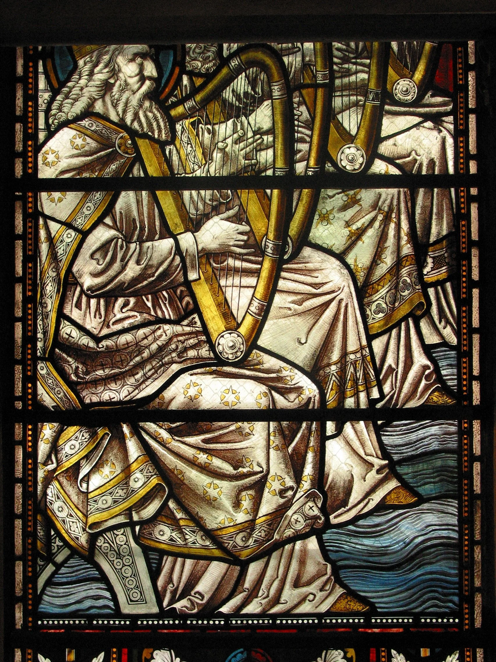 Moving to the first single-light window on the [south] aisle, and to the adjacent double-light window, these taken together illustrate vesicle six, “Heaven and earth are full of the majesty of Thy glory.” These were placed in the church in February 1886, before the church was put to use... In each of these three lights are two angels, the six angels each bearing a medallion. Upon each medallion is depicted the event of one day in the six days of the creation of the world. In the single-light window, the left medallion illustrates the darkness of chaos “without form and void;” the right medallion, the dividing of the waters which were under the firmament from the waters which were above the firmament. In the double-light window, the next medallion illustrates the gathering together of the waters and the appearing of the dry land, clothed with grass and herbs and trees; the fourth, the creation of the lights, the sun and the moon and stars, “the greater light to rule the day and the lesser light to rule the night;” the fifth, the creation of moving creatures on sea and land, the fish and the fowl; the sixth, the creation of man. In addition to setting forth the sixth vesicle of the Te Deum, the windows set out the extraneous text: “The sea is His and He/made it and His hand/prepared the dry land” (the fifth verse of the Venite).